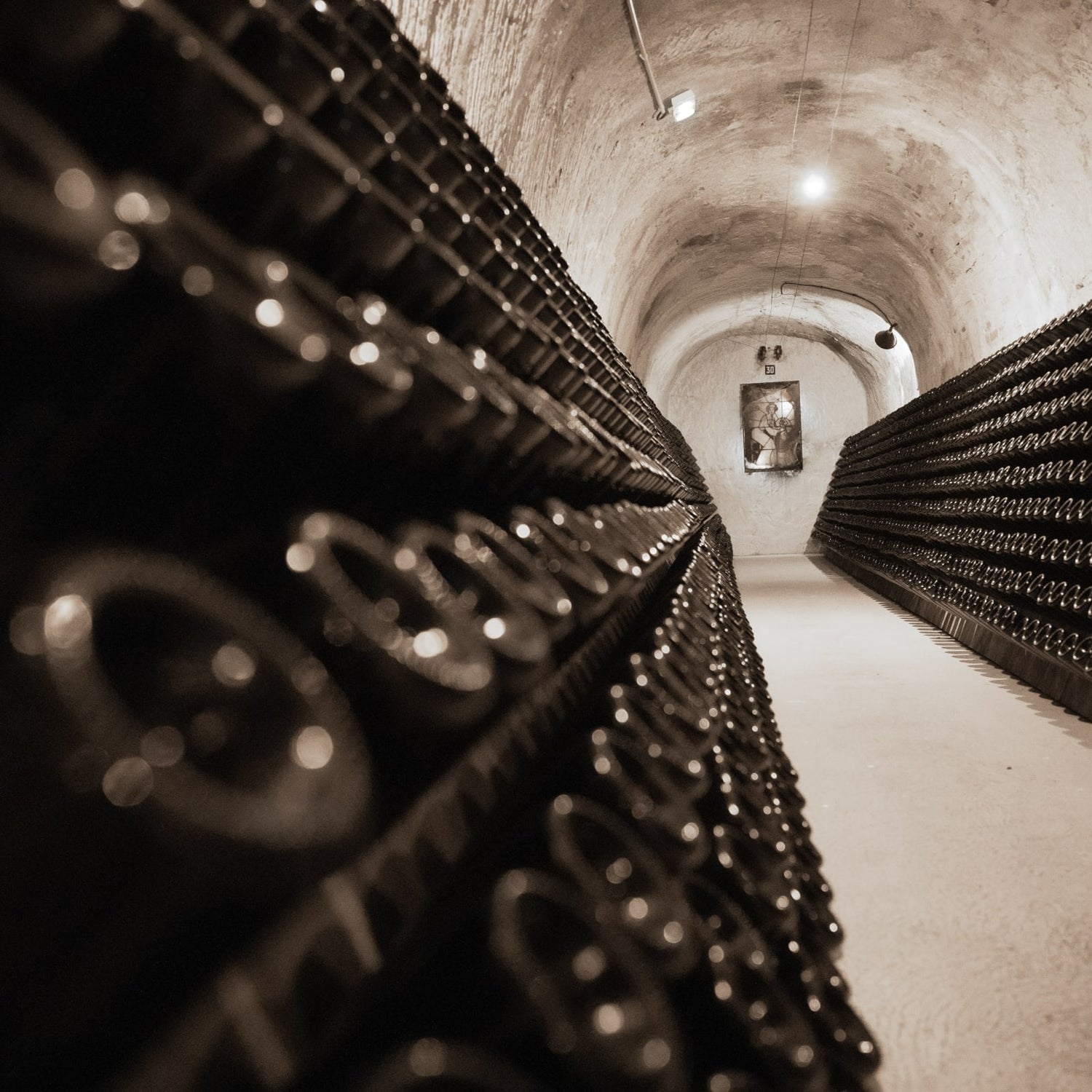 All our wines mature in the naturally optimal conditions of our cellars, carved into the chalk. Spread over four levels and six kilometers, 38 meters underground, our galleries ensure constant and ideal humidity, temperature, and darkness.