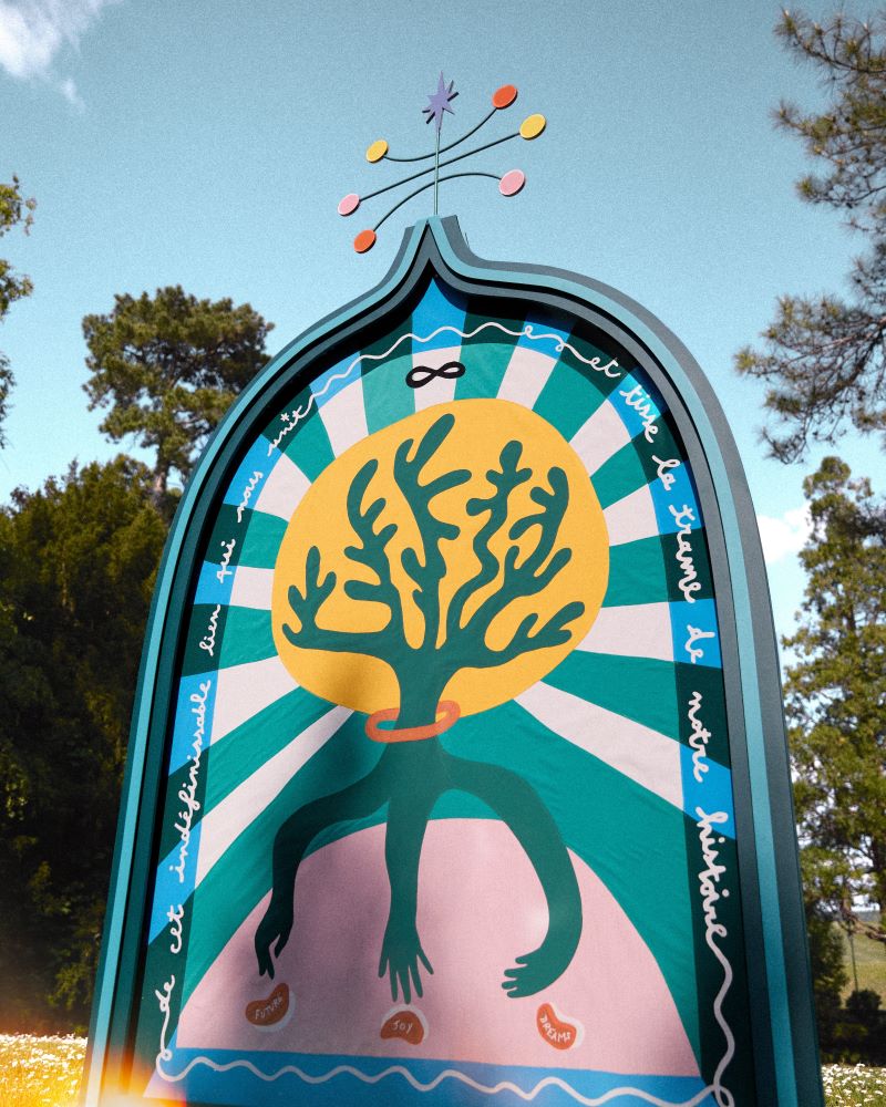 Cette arche accueillante et harmonieuse, sous laquelle figure un Arbre de Vie dont les racines se transforment en mains, illustre le travail des Femmes et des Hommes de la Maison et notre lien inéluctable à la Nature.